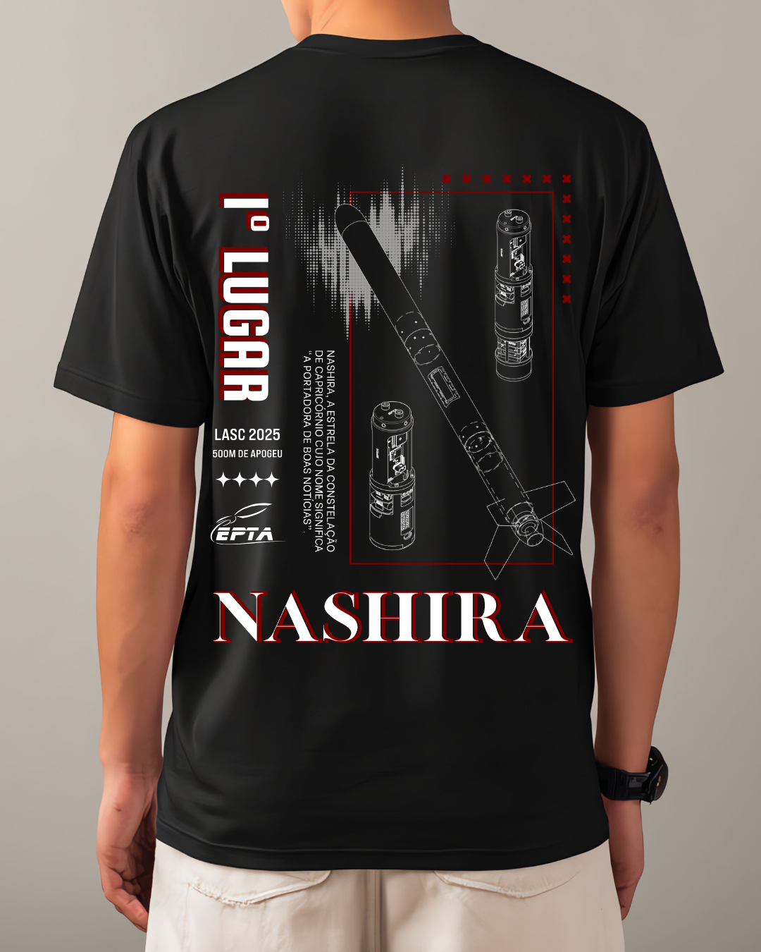 A camiseta EPTA é confeccionada em malha PV, oferecendo conforto, resistência e excelente durabilidade. Seu design exclusivo é inspirado na LASC 2025, competição na qual fomos campeões com o foguete Nashira, representando inovação, precisão e excelência em engenharia.